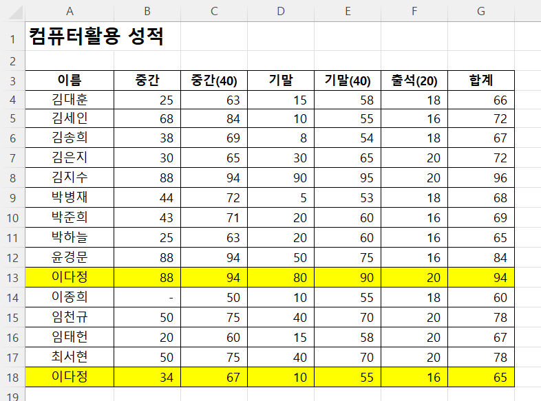 내가 원하는 데이터는 2번째의 이다정 학생의 출석 점수만을 원해요.(억지 같지만 실제로 빈번하게 있는 경우랍니다!)