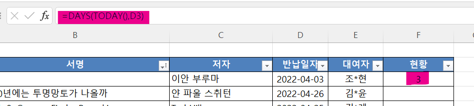 수식결과가 미리보기로 3이라고 뜨네요. 이것은 반납일자 +3일, 3일이 지났다는 의미겠지요?