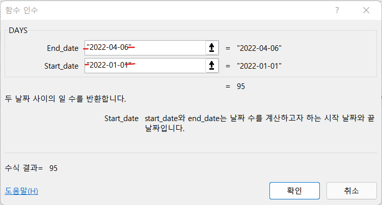 하지만 수식으로만 본다면 6일 - 1일 = 5일이 되기 때문이에요. 첫날(1일) + 5일 = 6일(오늘)이기 때문에 days함수가 95를 반환한다고 해서 95일째가 아닌, 1일 + 95일 = 96일, 오늘은 아흔여섯(96) 번째 날이 되는 것입니다.