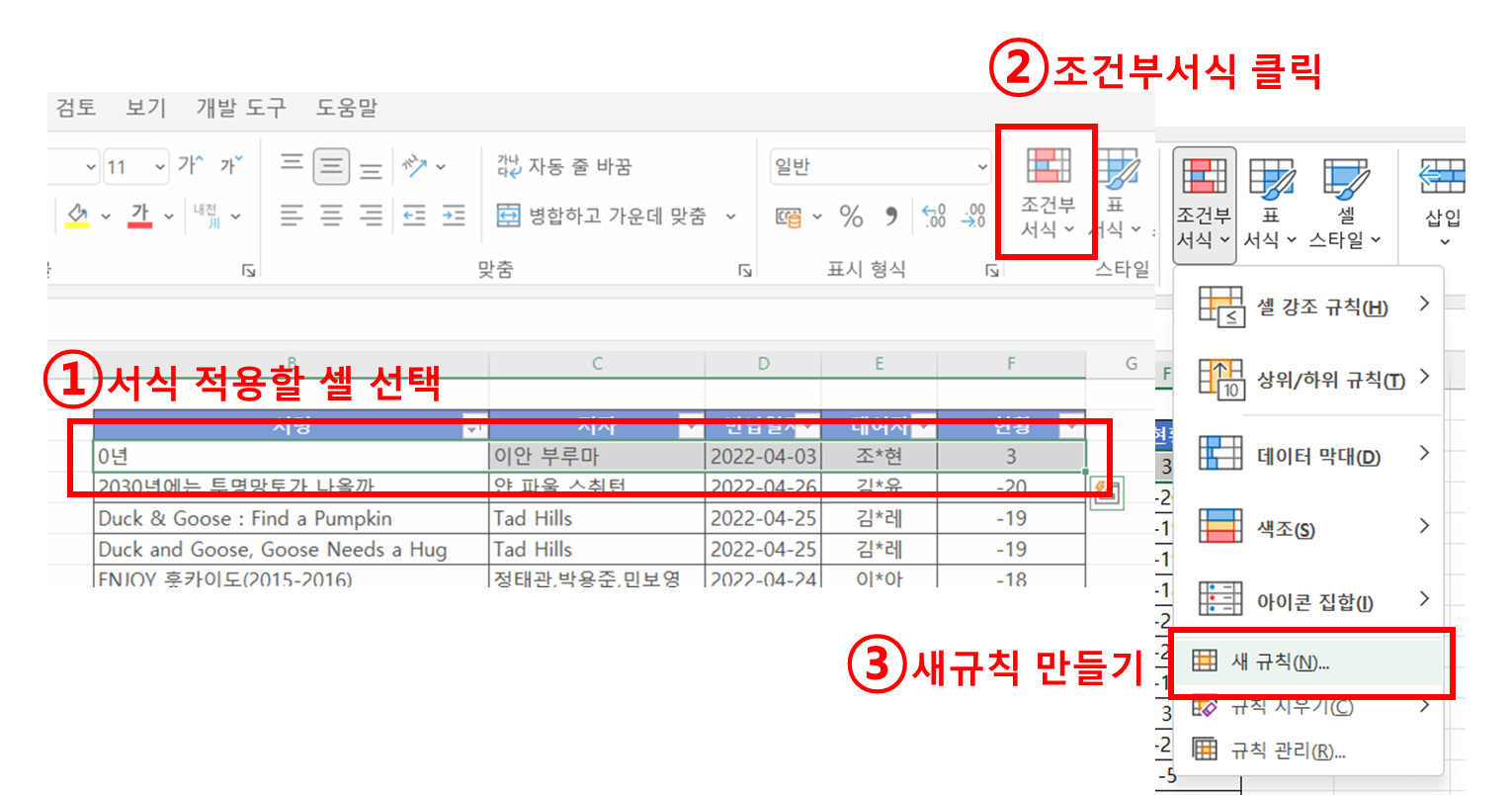 저는 연체도서의 모든 내용을 빨갛게 표시하고 싶어서 B3부터 F3까지 표의 한 행을 전부 드래그하여 서식을 지정할 것입니다.간단한 작업이라면 조건부서식 내의 미리 준비된 규칙을 설정하여도 되지만 직접 수식을 이용하는 법을 배우기 위해 새 규칙을 만들어보겠습니다.