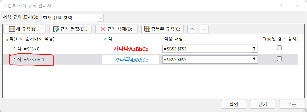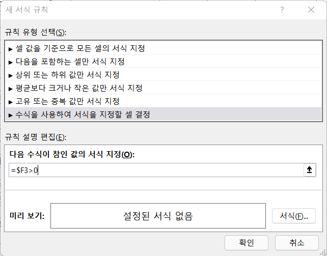 =F3>0 해석 : F3셀의 값이 0보다 크면(참이면) 아래 설정된 서식으로 변경하시오. |