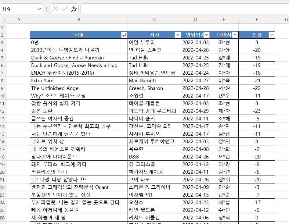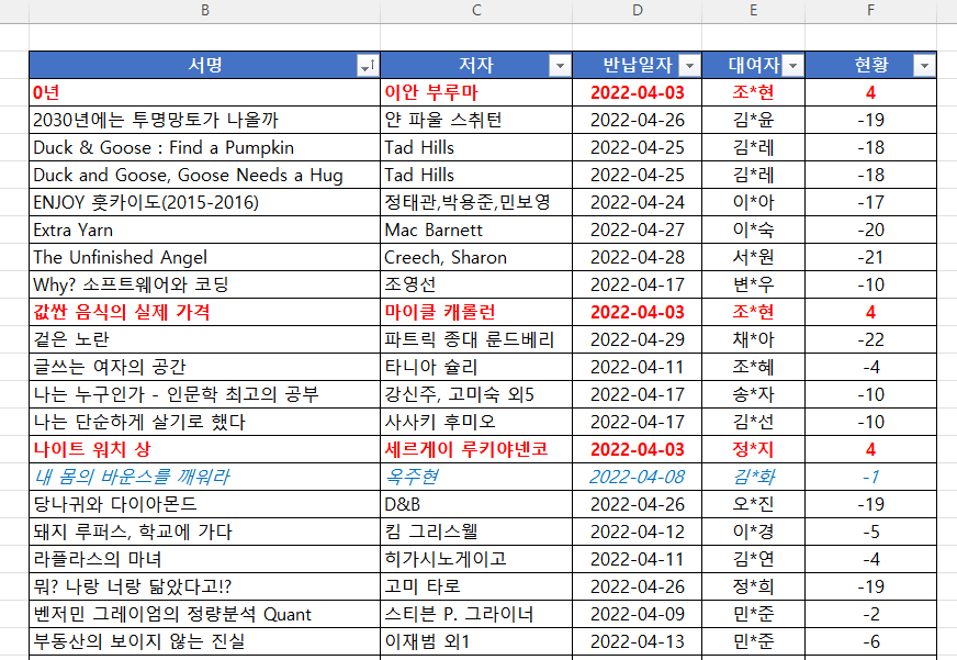 지난 글에서 [엑셀함수 : days + today함수]를 이용하여 대여된 도서에 대한 연체일, 반납예정도서 등을 숫자로 구해봤어요.