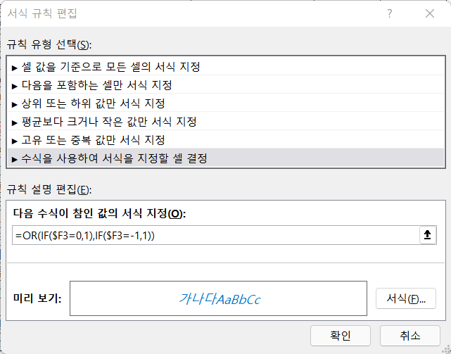 =OR(IF($F3=0,1),IF($F3=-1,1)) 해석 : F3셀의 값이 0이거나 -1이면 아래 설정된 서식을 적용하시오. |
