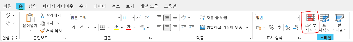 조건부서식을 클릭하여 원하는 규칙을 선택하거나 새 규칙을 만듭니다.