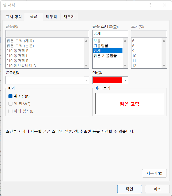 미리보기 오른쪽의 [서식(F)...] 버튼을 눌러 셀 서식을 마음껏 취향대로 지정해봅니다.