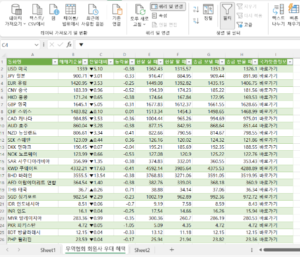 워크시트가 하나 생성되고 인터넷 화면에서 본 환율정보를 그대로 엑셀 표로 가져올 수 있습니다.
