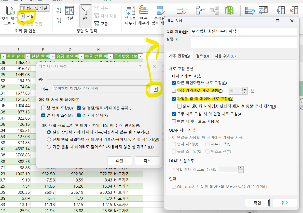 쿼리속성으로 들어가서 다양한 새로고침 옵션들을 필요에 맞게 설정해서 사용하시면 됩니다.
