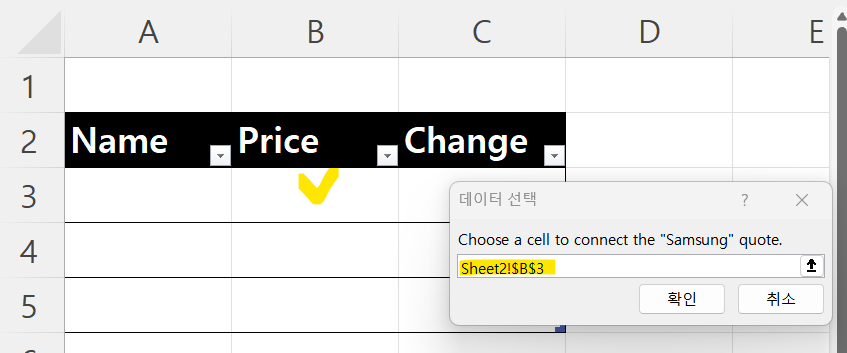 connect 버튼을 누르면 어느 셀에 연결할 건지 나오고, 기본은 가격에 대한 연결입니다.