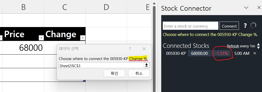 가격을 연결하고 나면 연결된 정보들이 뜨는데 동그라미친 변동률을 누르면 다시 한번 셀연결 창이 뜹니다.