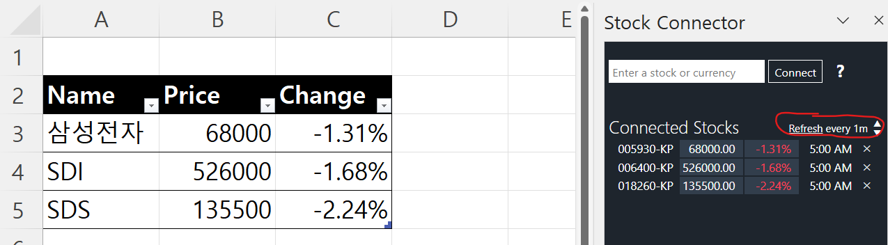 삼성을 검색해서 나오는 주식들 중에 눈에 익은 것들을 넣어봤는데 오늘은 다 떨어졌네요ㅎㅎ커넥터에서 업데이트 주기도 선택할 수 있구요.