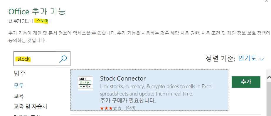 엑셀의 다양한 add-in 어플리케이션 중에 주식과 환율을 실시간으로 가져오는 "Stock connector"를 설치해서 정보를 가져와보도록 하겠습니다.