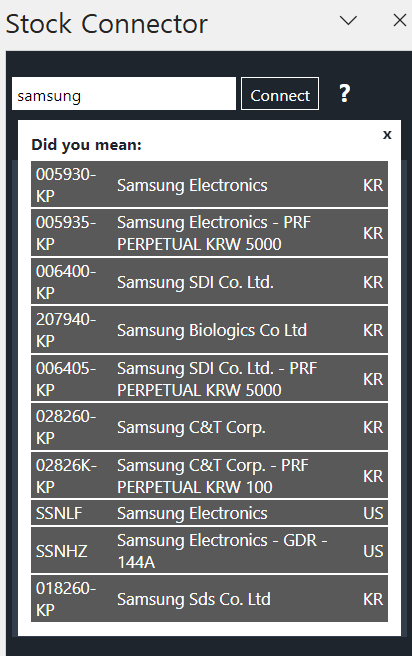 samsung을 검색해보니 여러 관련 주식들이 나오고 국가정보도 나오니까 잘 구분해서 선택해주세요.