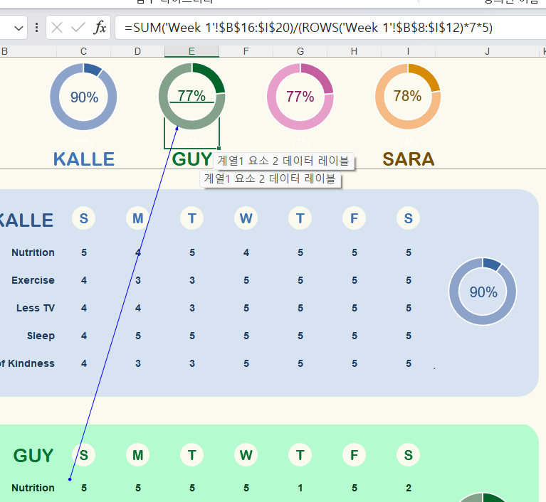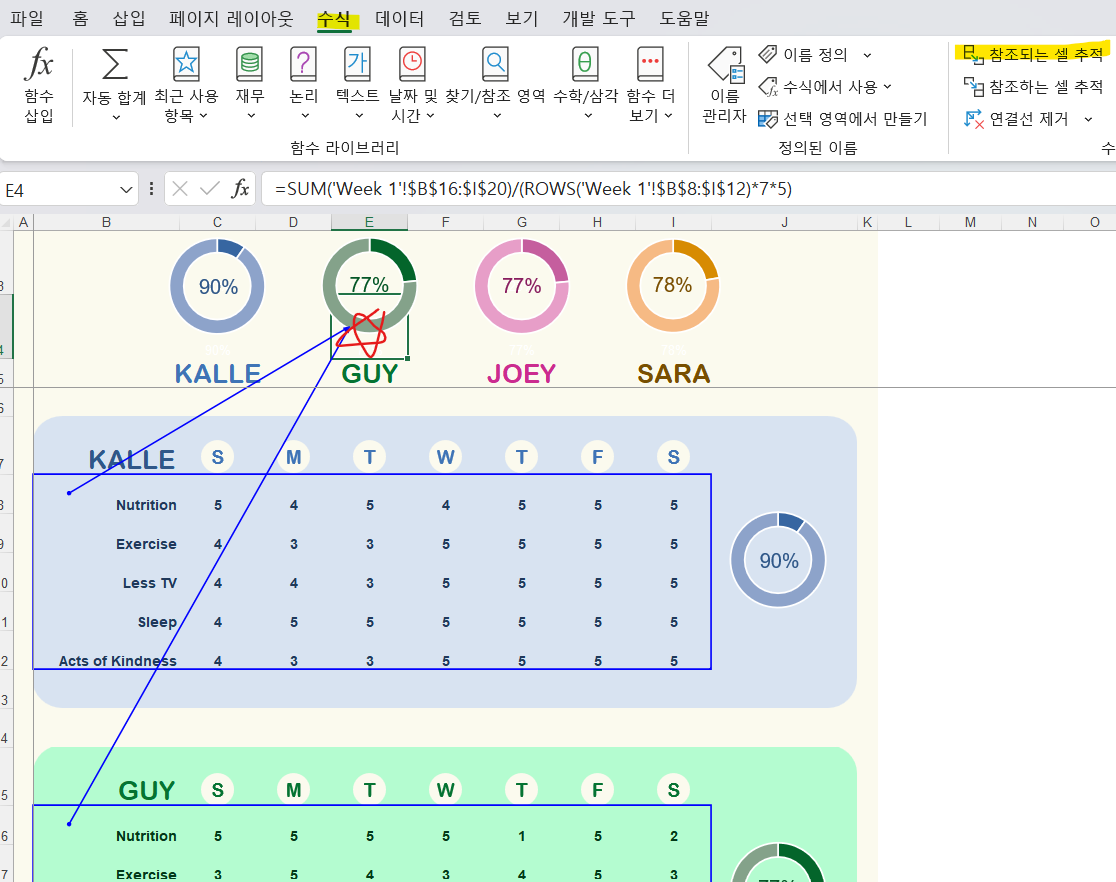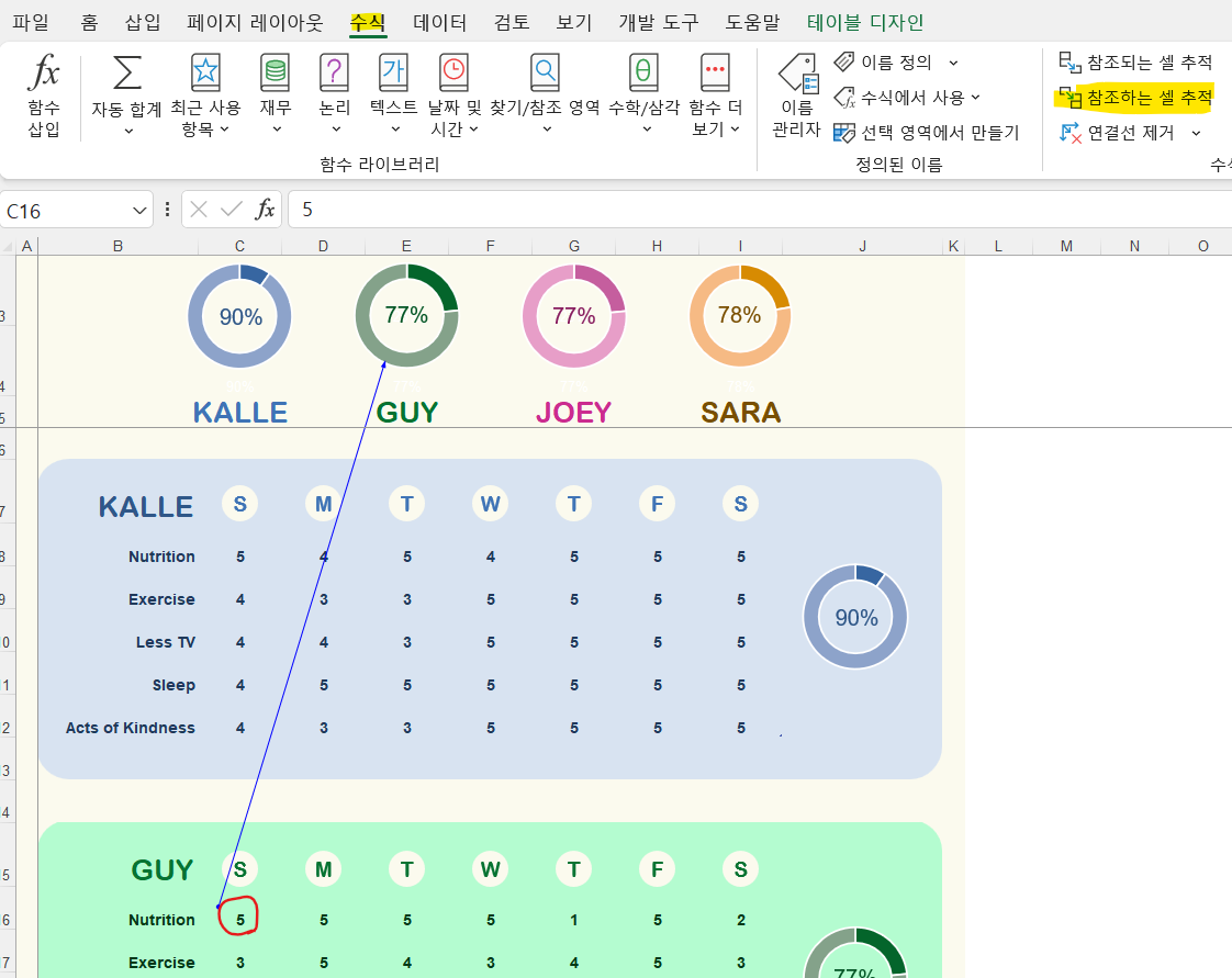 [참조되는 셀 추적]을 눌러서 해당 수식이 어떤 부분을 계산하고 있는지 확인이 가능합니다.