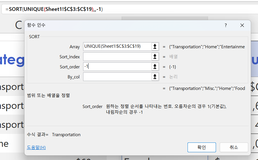 정렬 함수는 SORT함수를 이용할 것이고요. 첫번째 인수만이 필수입니다.