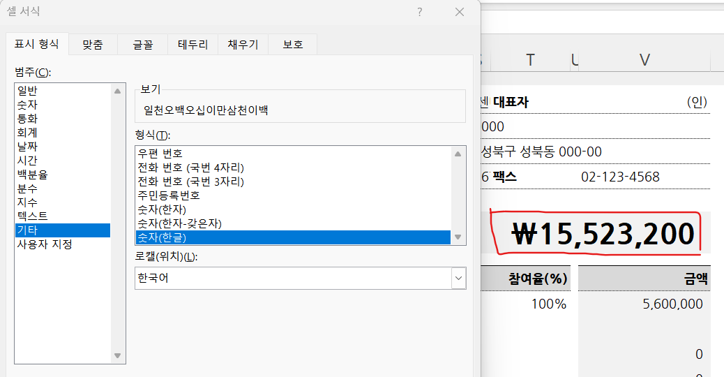 해당 셀에서 우클릭 후 [셀서식] - [기타] 범주로 들어가면 숫자가 있습니다.