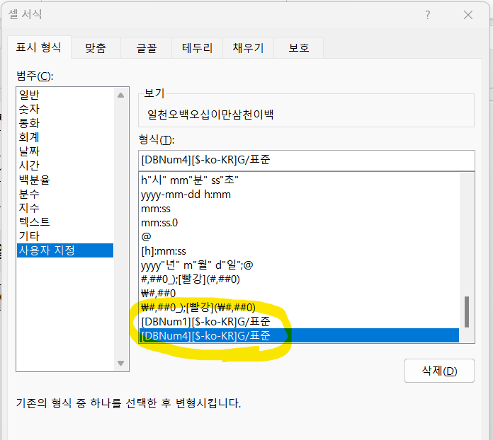 [사용자지정]으로 그대로 들어가면 숫자->한글로 바꿀 수 있는 엑셀 형식이 자동으로 기입되어 나타납니다.
