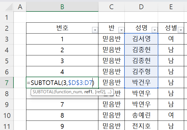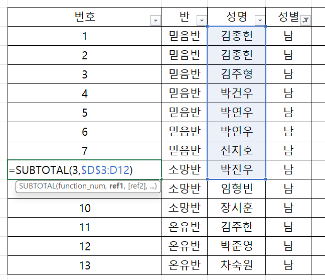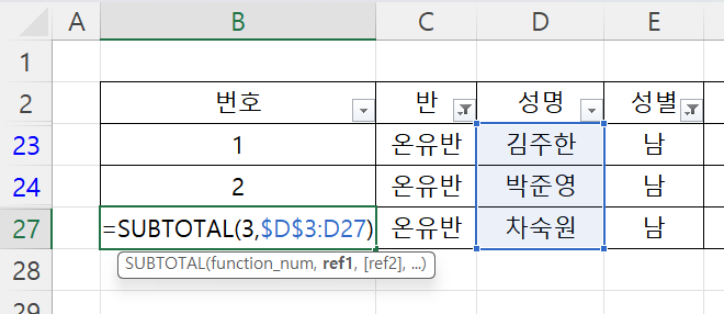 필터를 2개를 걸어도 화면에 필터링된 부분합만 계산해서 번호가 자동으로 바뀌는 것이죠!