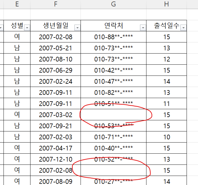 예를 들어 이렇게 연락처처럼 정보가 비어있다면 제대로 갯수를 세지 못하고 그럼 순번이 꼬이게 되겠죠.