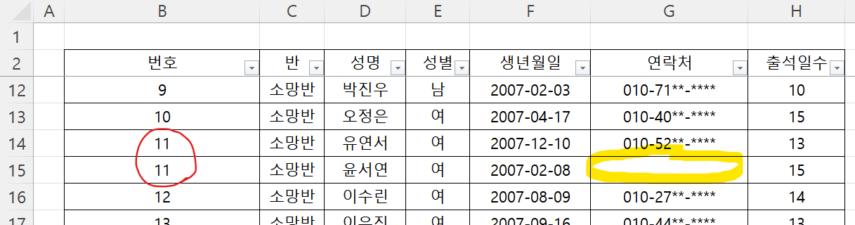 이때 B열의 번호까지 필터링이 되어버렸어요.
