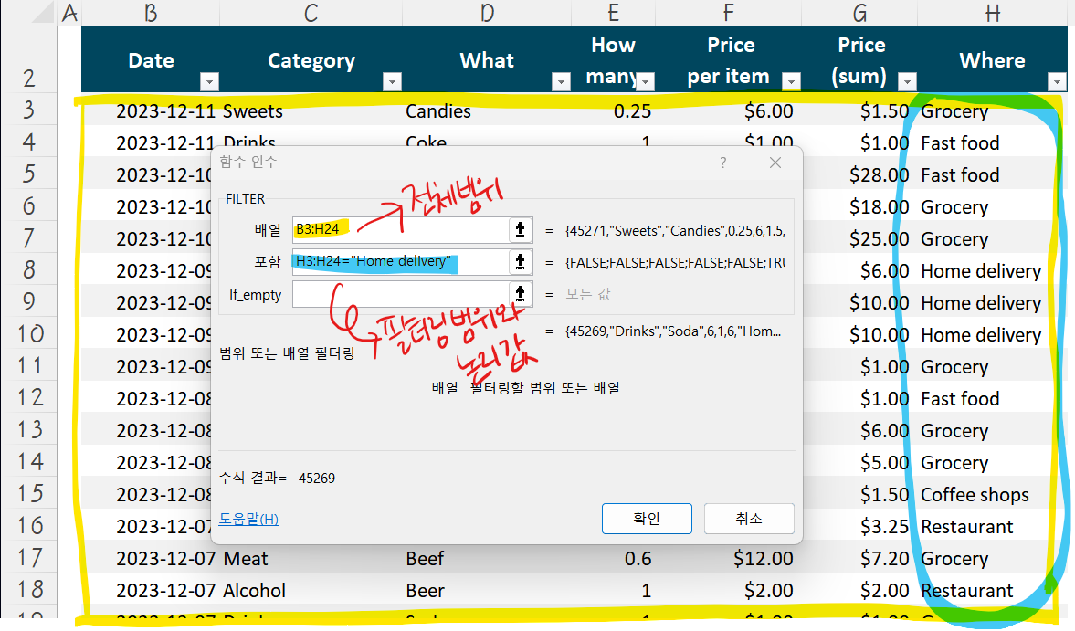 이번에는 원하는 데이터를 FILTER함수를 이용해보겠습니다.