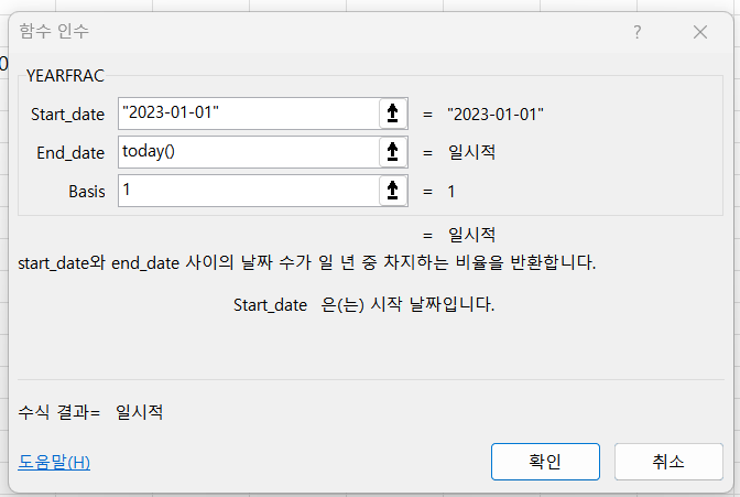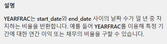 Yearfrac함수는 비율을 반환합니다. 1년을 기준으로 100% (숫자로는 1)이고 반년이면 0.5, 1년 반이면 1.5를 표시해줍니다. 도움말에서는 이 함수를 이용해 연간 이익, 채무 비율 등을 구할 때 사용할 수 있다고 합니다.