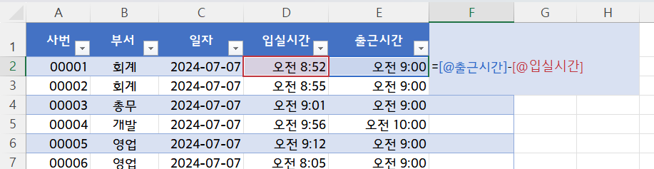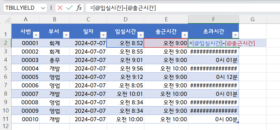 여기서 초과시간, 즉 지각한 시간을 계산해보겠습니다.
