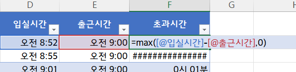 그래서 MAX함수를 이용하여 초과시간을 계산하는 예제를 가져와보았습니다.