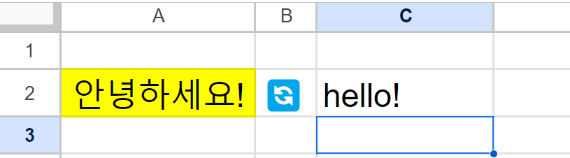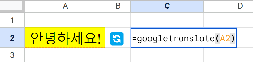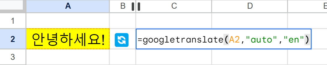 | =googletranslate(A2,"auto","en") | A2의 텍스트를 자동으로 감지(auto)해서 영어(en)로 바꿈 |